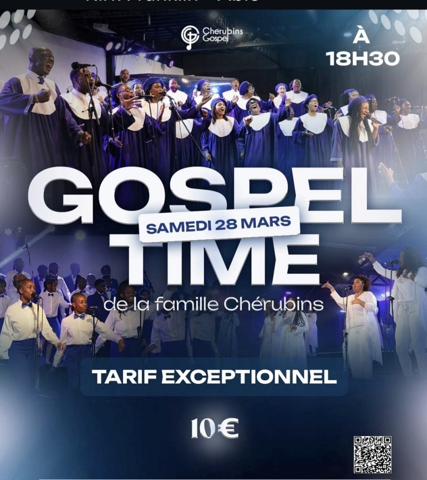 La grande chorale des Chérubins Gospel sera en concert au Centre Bethel AEFPC à partir de 18h30. Un moment unique pour vivre un véritable Gospel time et découvrir la richesse du gospel à travers ses différents styles.