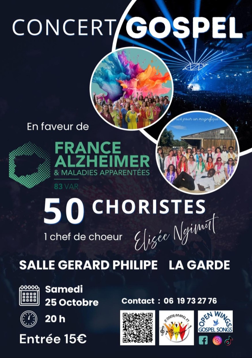 A La Garde, samedi 25 octobre Elizée Ngimut et ses 50 choristes seront en concert en faveur de France Alzheimer ;
