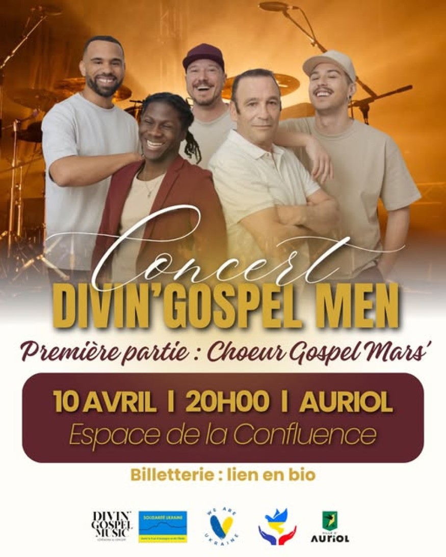 Le quintet Divin’Gospel Men sera en concert à l’espace de la confluence à 20h00. Une soirée musicale intense, portée par des voix puissantes et une énergie communicative… le tout dans un esprit de partage et de solidarité avec en première partie la chorale de Magali Ponsada, Chœur gospel mars’